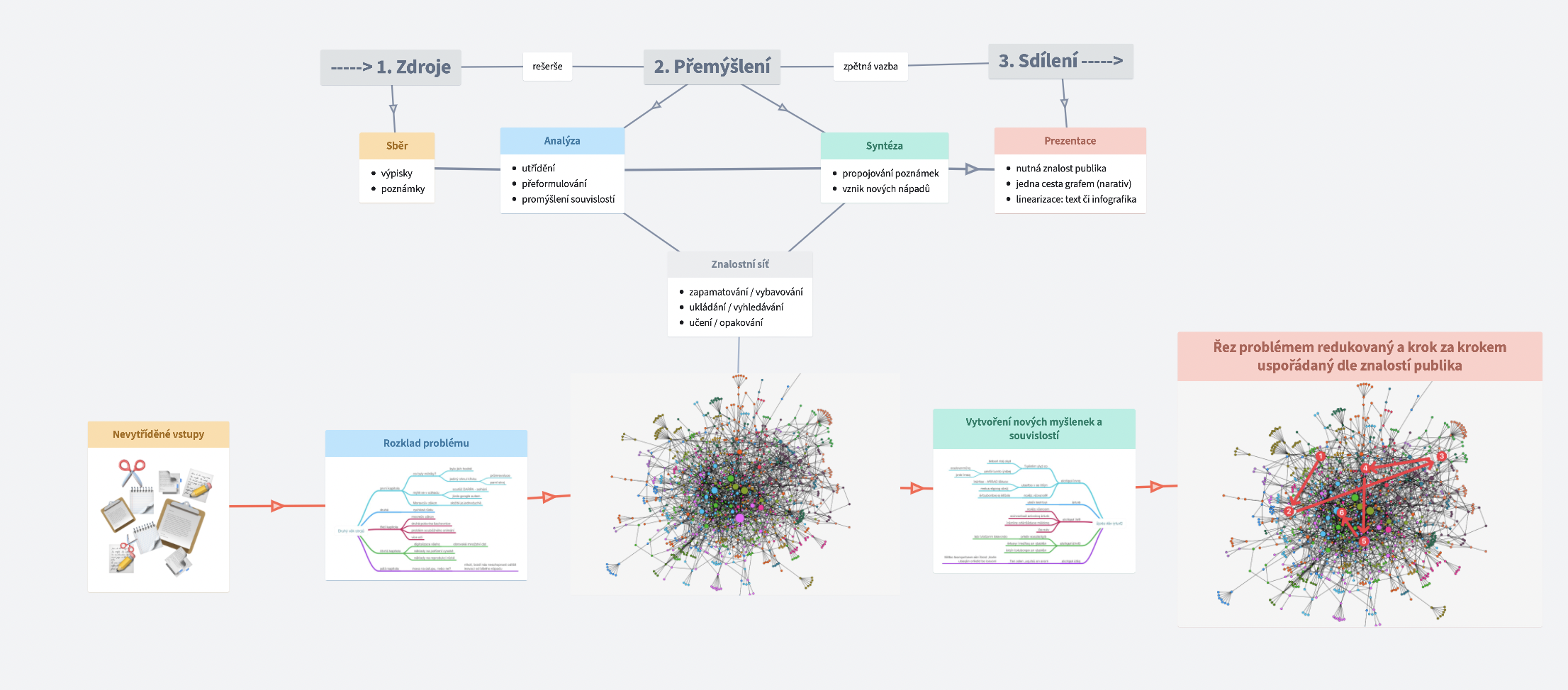 Zlomyslně bych mohl napsat, že kdyby byl tento článek myšlenková mapa, tak tady by končil: rozebral téma na součástky a hodil je do odrážek (ok, ještě chybí ty barvy). Abyste ale z mé kritiky něco měli, nabízím i východiska a – chcete-li tipy – jak se posunout dál, zejména pokud máte v úmyslu tvořit něco nového a sdílet to. Typicky: psát knihu či třeba přednášet.