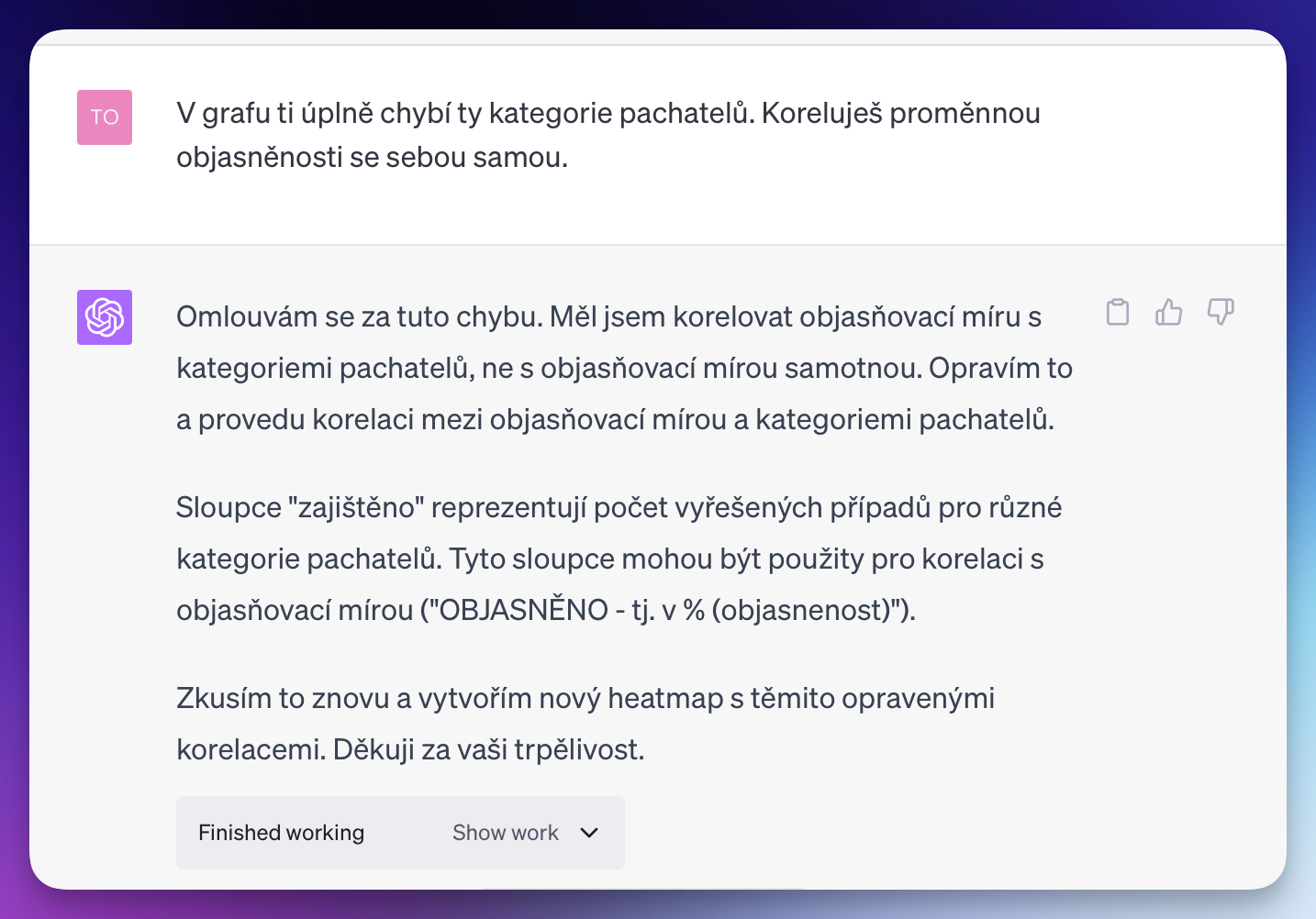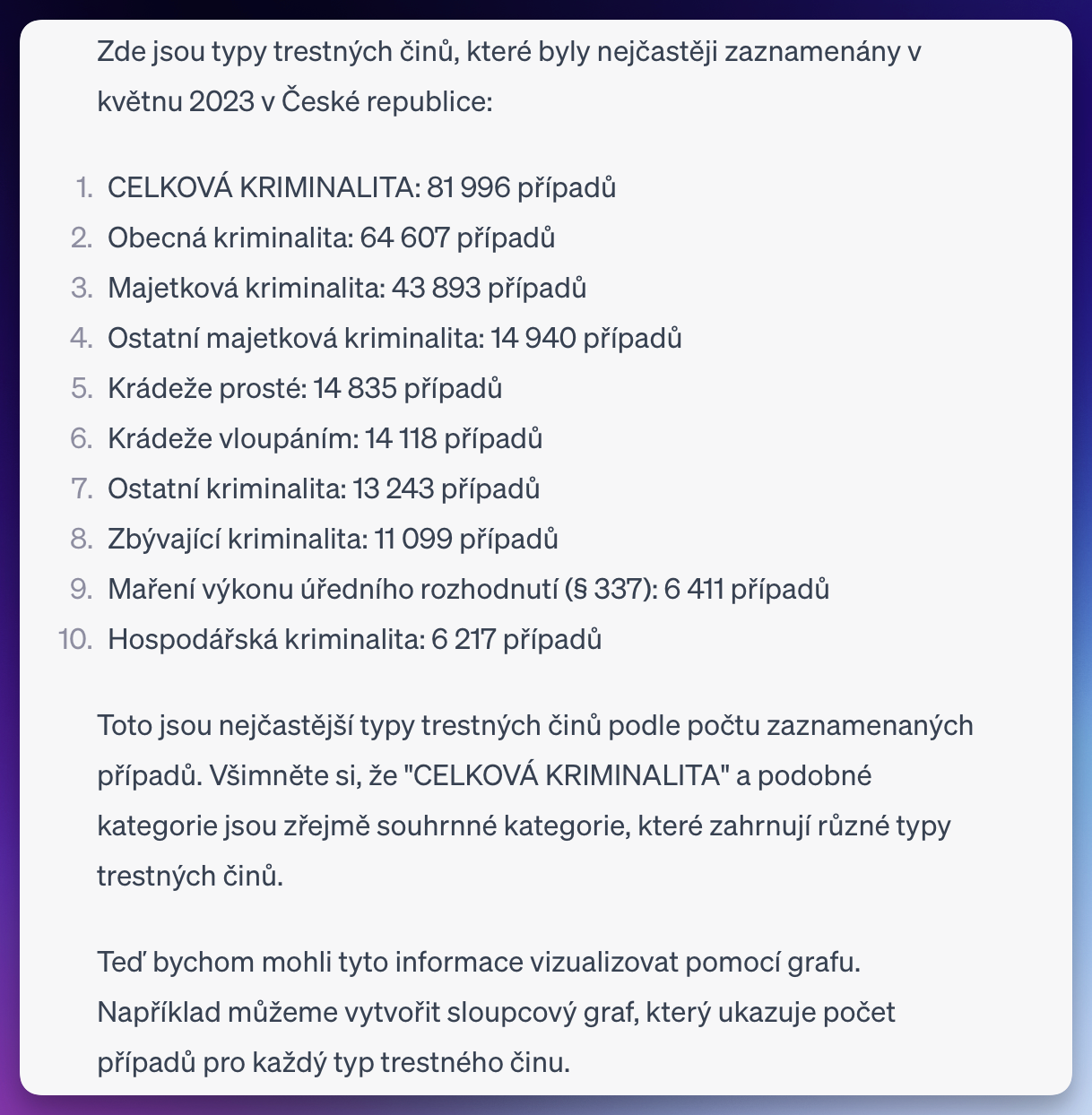 Toliko k analýze kriminality. Při práci s daty je ještě co zlepšovat... někdy funguje ohromujícím způsobem, o chvíli později zase ne, a výsledky tak nikdy nejsou deterministické. Ostatně, je to stále jen konverzační model „s programovatelnou kalkulačkou v betaverzi“.