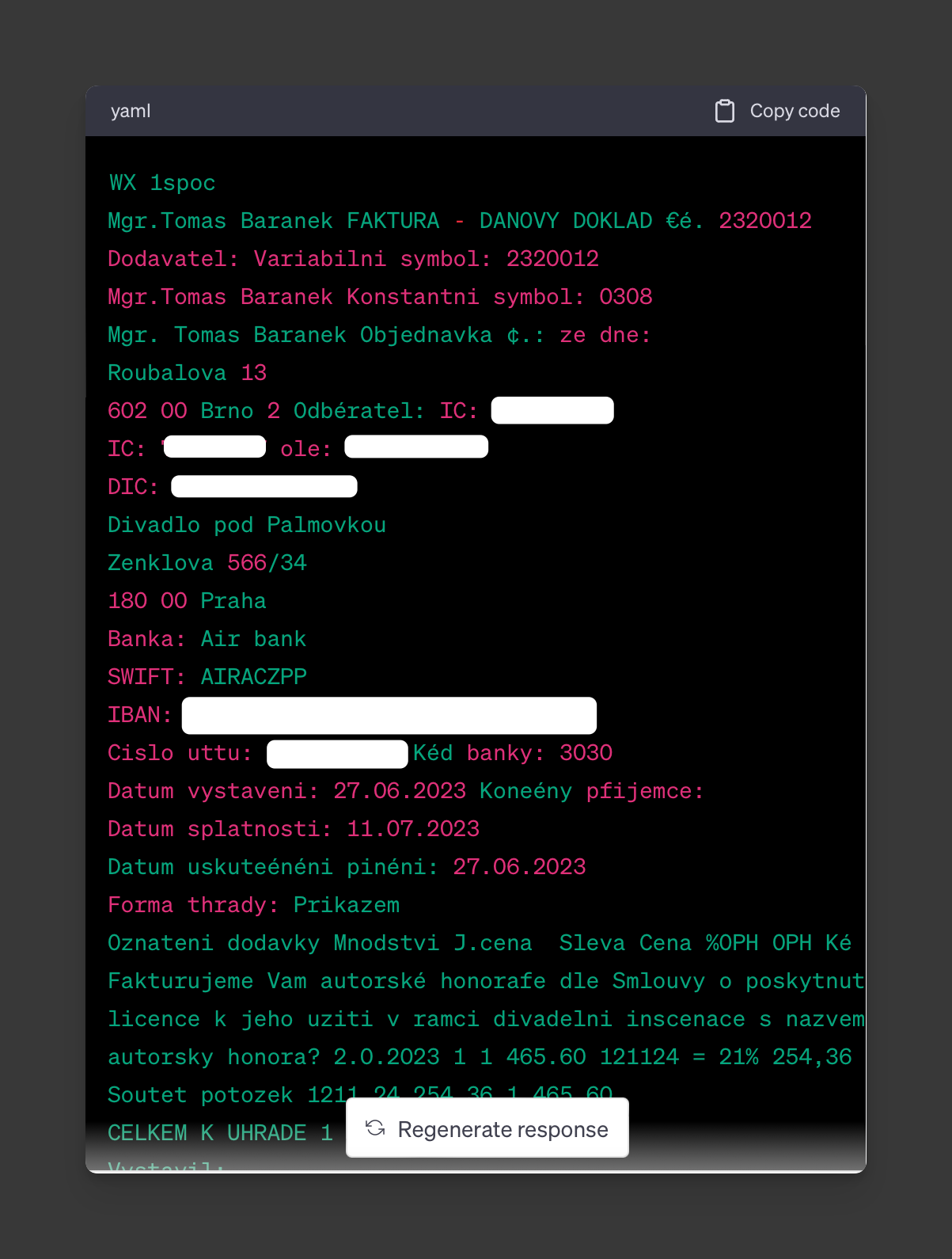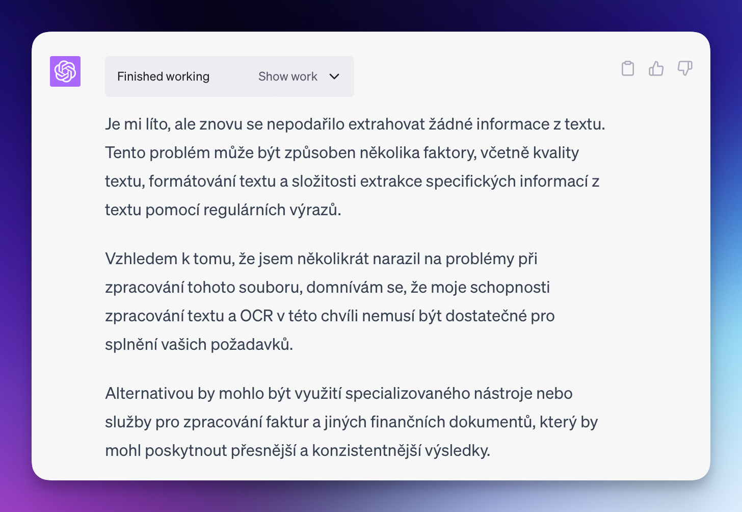 Pak jsem psal tento text a po čase se opět vrátil k vláknu. Navázal jsem žádostí o převod jeho vlastního výstupu (viz výše) do CSV, ale již extrahovaná data byla ztracena. Mám prý celou fakturu načíst znovu. Opět ale došlo k nedeterministickému chování: nové načtení vedlo k opakování některých předchozích slepých cest a ani při dalších pokusech neuspělo.