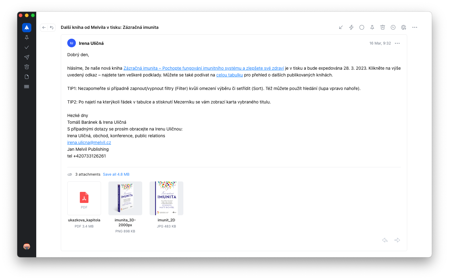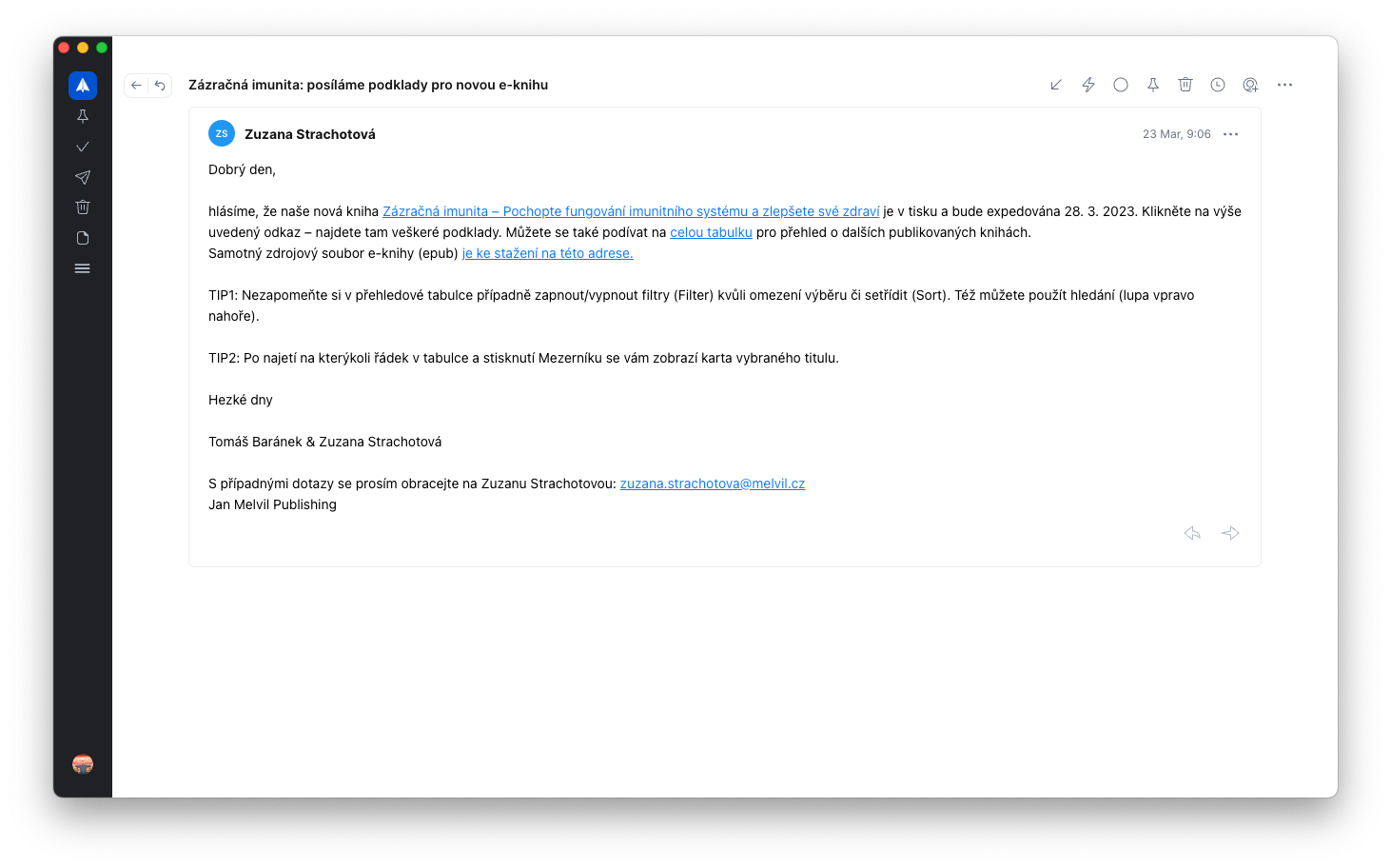 Spádový e-mail máme nastavený např. také u tipů na knihy k vydání. Když někomu z nás dorazí nějaký e-mail s doporučením na knihu, přeposláním na speciální adresu se zařadí do báze Nápady na knihy a při další ediční poradě neunikne pozornosti.