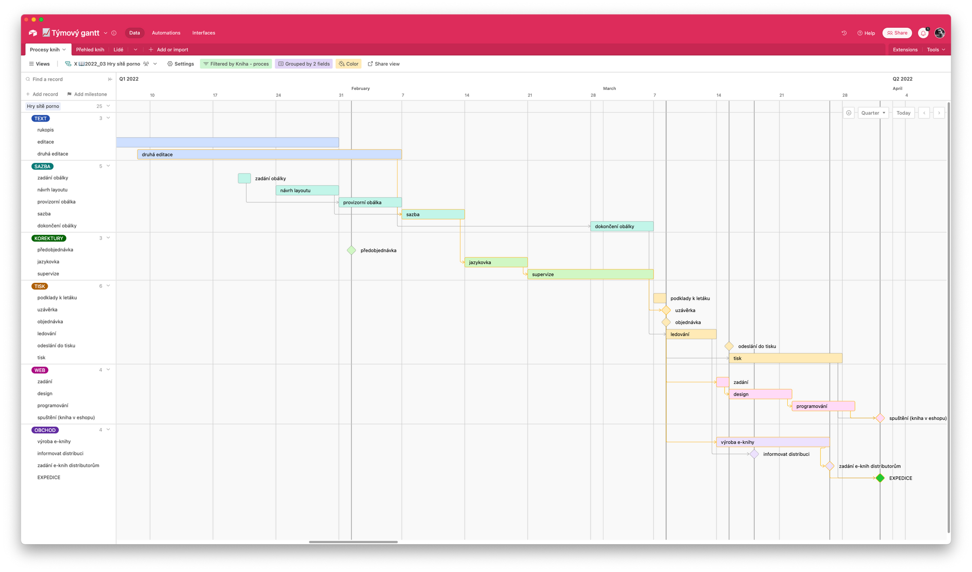TeamGantt fungoval dobře, ale byl to další systém s vlastním rozhraním, který bylo nutné platit, udržovat a ručně synchronizovat s ostatními daty (přímou synchronizaci s Basecampem či kalendáři sice umí, ale ne dle našich představ). Jaké štěstí nás potkalo, když Airtable před dvěma lety představil vlastní Gantt diagram kompletně propojený s funkcionalitou databází, které už v něm máme! Okamžitě tak nahradil TeamGantt (čímž nám ušetřil nižší tisíce dolarů ročně) a opět – umožnil s daty pracovat, jak potřebujeme my.