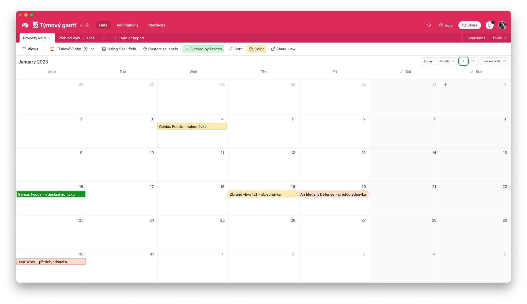 Různí kolegové a kolegyně do procesu knihy vstupují v různou dobu. Redakce je u knihy již od úplného začátku, ale produkci kniha začíná zajímat, až když má smysl začít řešit termín objednávky tisku. Máme tak detailní krátkodobé pohledy (tzv. Views) pro editory, pětileté pohledy pro marketing a další. Kolegové, kteří se knize nevěnují od začátku a nejsou ani součástí procesu její výroby, pak mají své nejdůležitější termíny nasdílené do svých kalendářů (iCloud Calendar, Google Calendar, Outlook). Například Tomáš Baránek má ve svém osobním iCalu automaticky zobrazené jen časové bloky pro svou supervizi (proces, kdy má knihu finálně přečíst před tiskem), a také u všech knih datum expedice. (Nic víc vědět nepotřebuje, ale potřebuje, aby data byla zaručeně aktuální a mohl plánovat, znáte ho :).