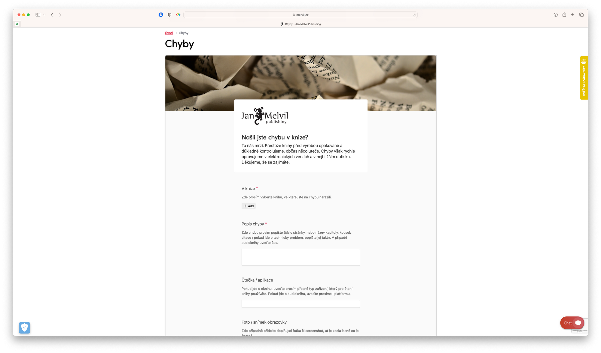 Ačkoli naším snem jsou knihy na první dobrou dokonalé a bezchybné, šotci si najdou skulinky, jak se zviditelnit. Pro jejich odchyt používáme pasti ve formě veřejných formulářů (Forms) v Airtable, které jsou napojené na hlavní bázi knih a její podbázi Errata, neboli Chyby. Díky snadnému prolinkování jednotlivých bází a ukládání příloh nám čtenáři hlásí konkrétní chybu ke konkrétní knize v jednoduchém formuláři (https://www.melvil.cz/chyby – mimochodem, ten je v tomto případě velice snadno vložen/embedován do našeho webu).