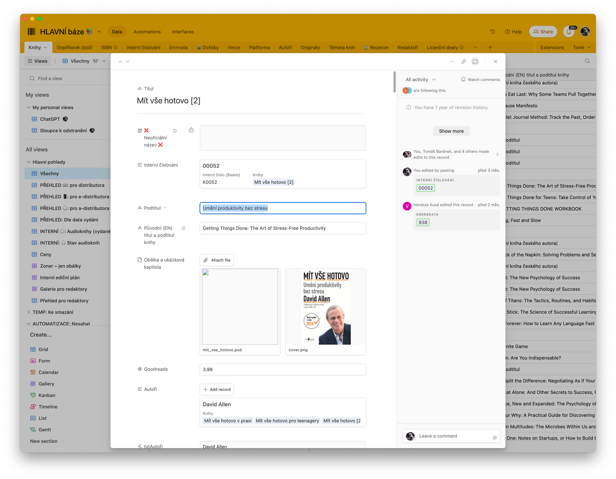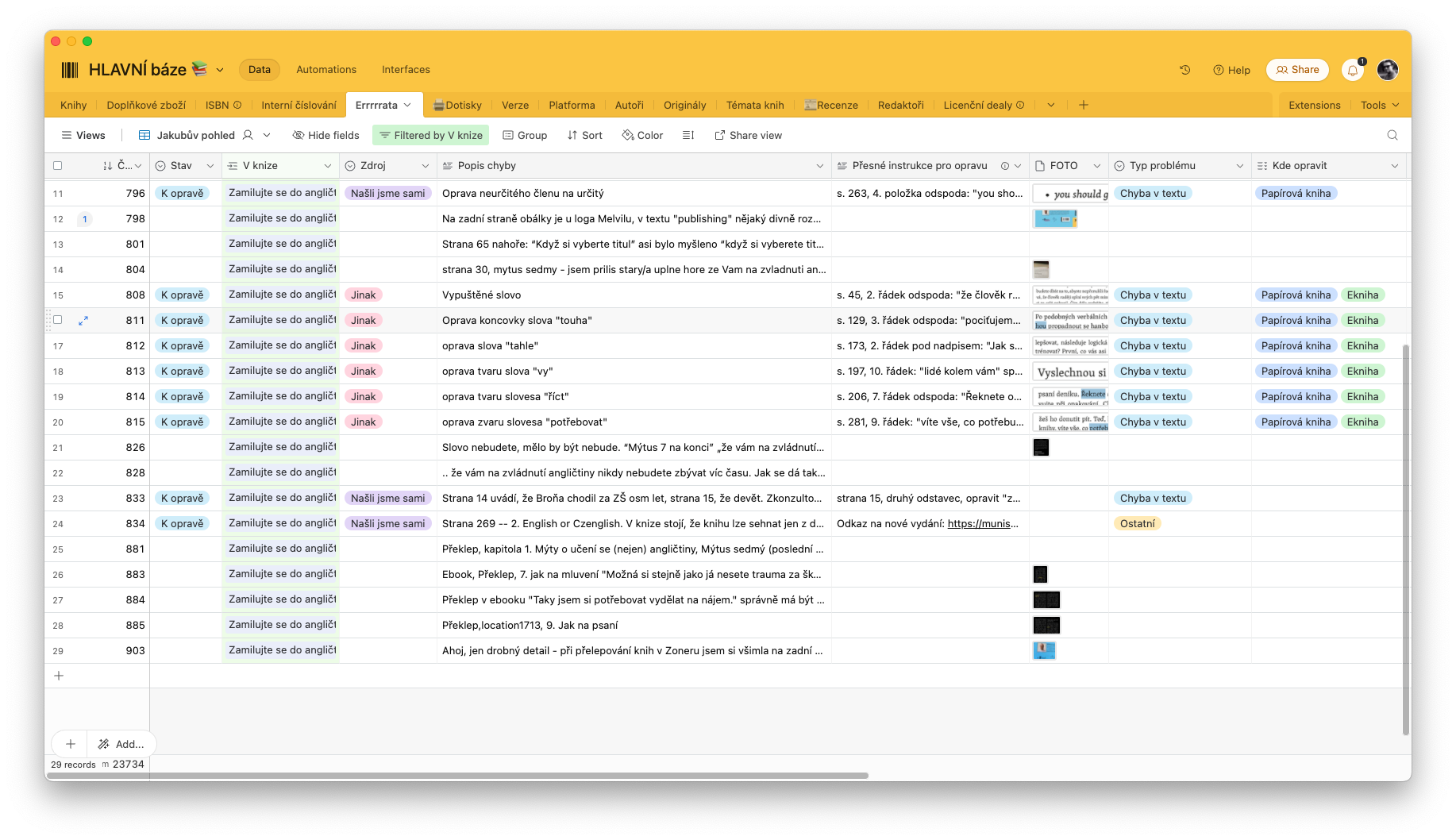 Další silnou stránkou Airtable proti běžným „excelům” jsou její široké možnosti napojení na další aplikace (API). Díky nim u nás probíhá automatická i poloautomatická výměna informací mezi Airtable a dalšími appkami, které používáme; a taky mezi námi a partnery. Víme vše o dostupných kapacitách lidí, máme kompletní metadata ke knižním titulům, sledujeme dotisky, v kanbanu třídíme nápady na nové na knihy, redakce si spravuje rozsáhlý terminologický slovník, zájemci o práci nám tam padají do fronty, chodí nám chytré notifikace… prostě jsou tam všechna klíčová data, která při cestě nakladatele potřebujeme: všechna na jednom místě, interaktivní, vždy dohledatelná.