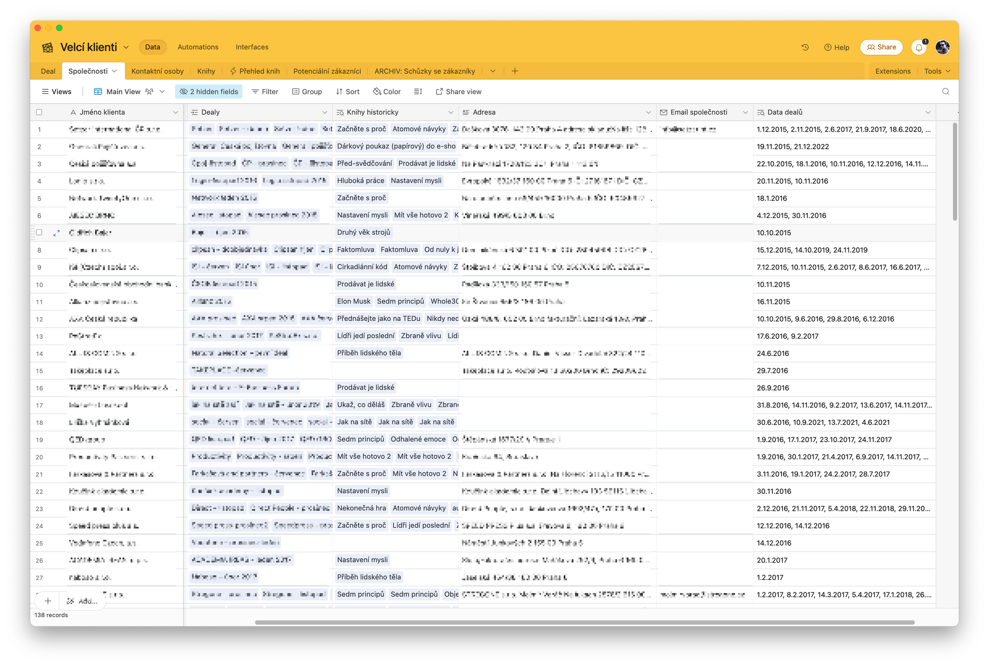 Jedním z důvodů, proč jsme před lety přecházeli k Airtable, byla potřeba vnitrofiremního CRM, správy našich kontaktů a velkých zákazníků/firem, kteří naše knihy nekupují přes e-shop nebo knihkupce, ale pořizují je pro své partnery a zaměstnance napřímo výhodněji u nás.