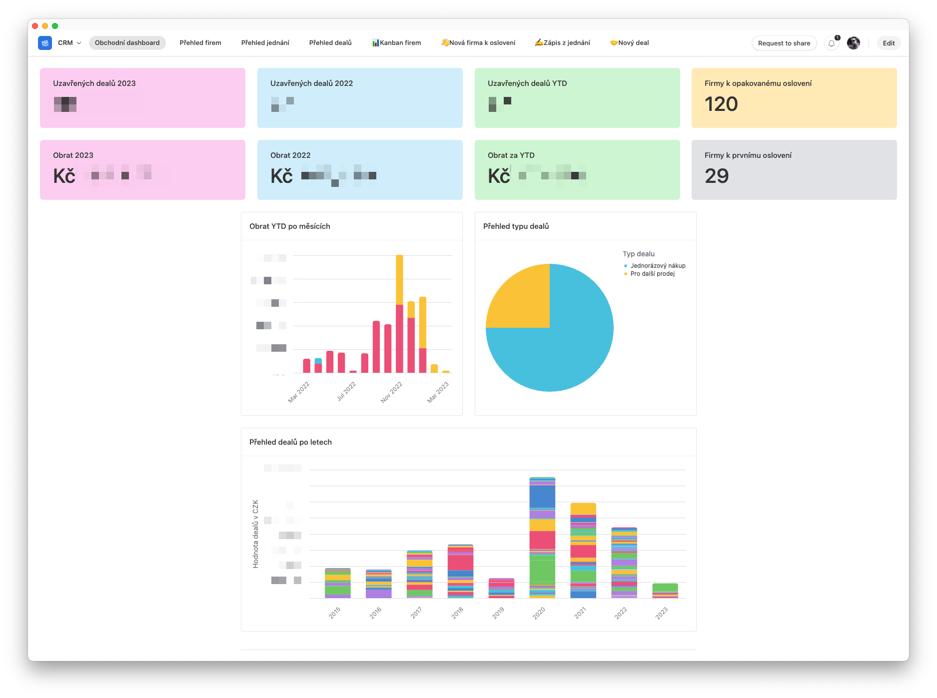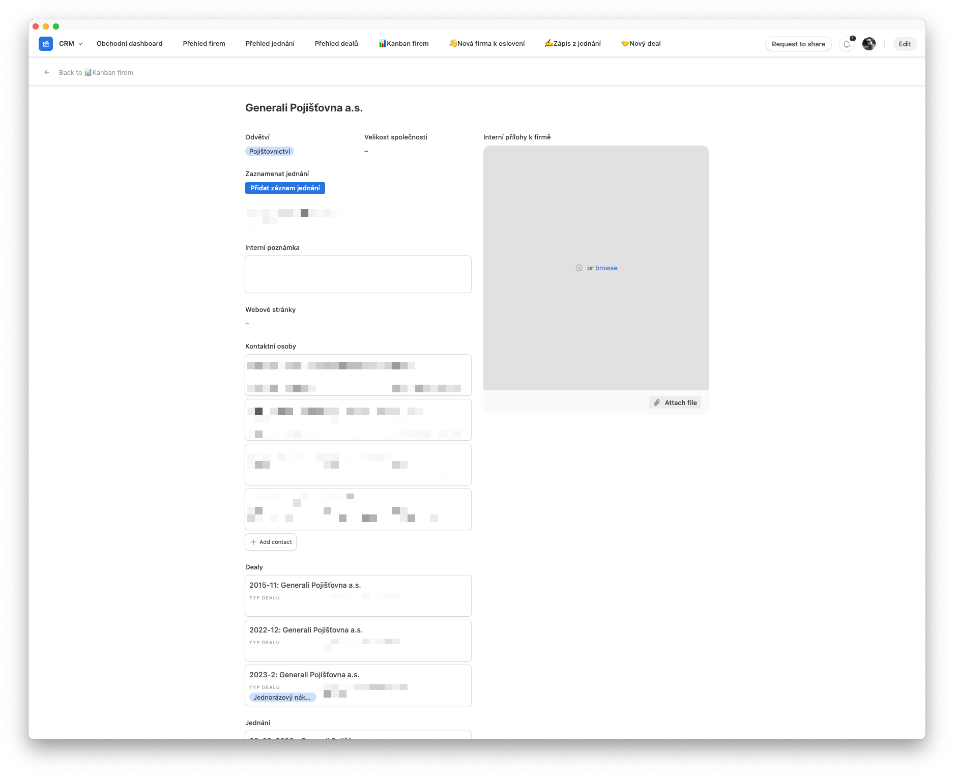 Rozhodli jsme se proto naše CRM značně zrobustnit a doplnit do něj funkce, které nám toto všechno umožní. Přidali jsme záznamy z jednání, přidali jsme evidenci kontaktních osob a vymysleli, které statistiky o dealech chceme mít přímo na očích. A k tomu všemu nám pomohly právě Interfaces.