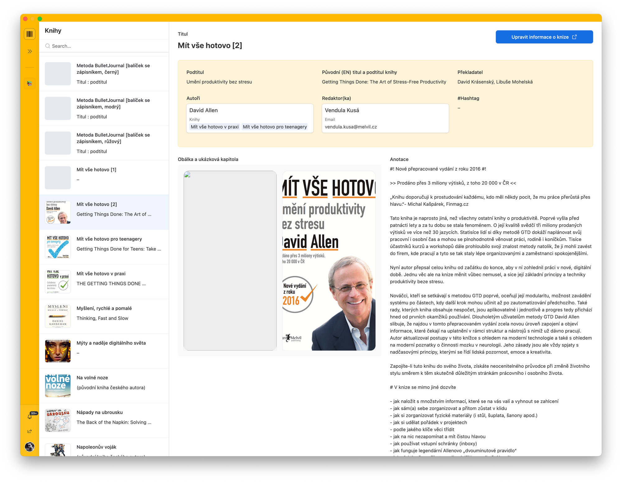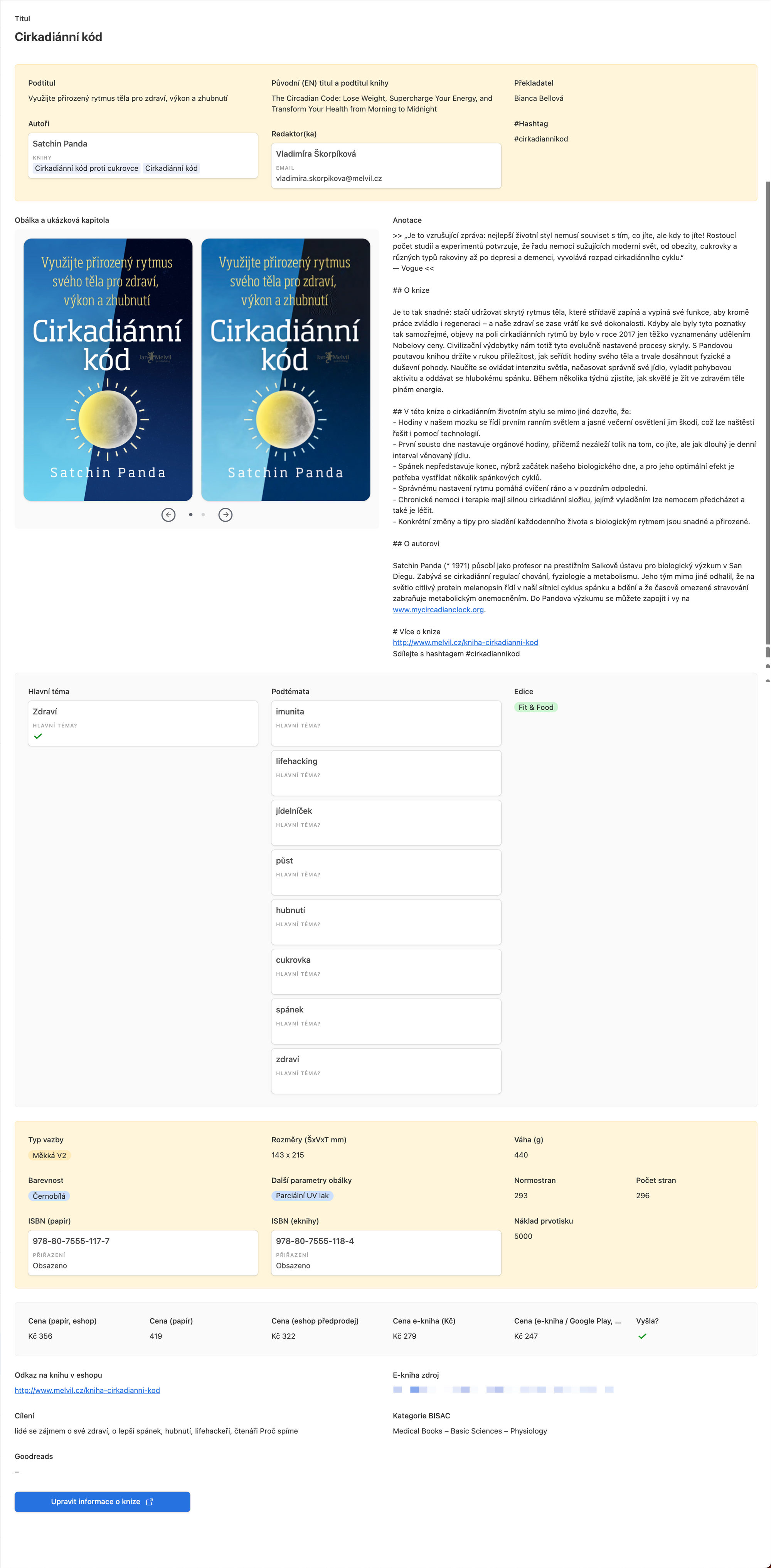 Metadata knihy se průběžně doplňují, pracuje na nich celý tým z různých částí republiky, ale trvale jsou jen na jednom místě – takže když se posbírají a udělá se z nich e-mail pro partnera, je vždy aktuální a z jediného oficiálního zdroje: