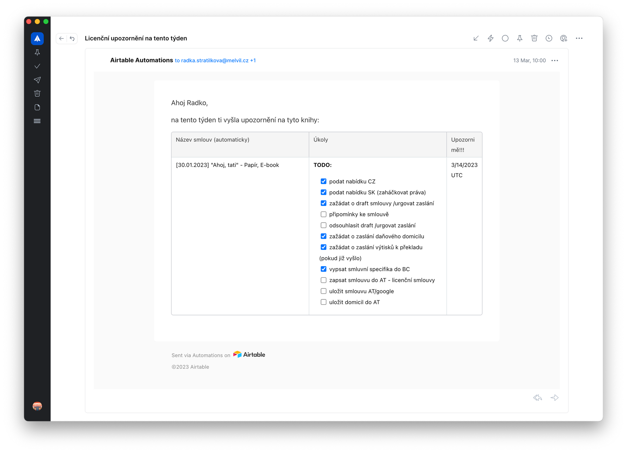 A protože už u každého titulu všechny údaje a také smlouvy poctivě evidujeme, stačilo přidat políčko datumu vypršení a nastavit jednoduchou automatizaci, která půl roku předem varuje e-mailem několik lidí z týmu, že té či oné knize končí licence. Máme tedy vždy přehled a jistotu, že se vyhneme máslu na hlavě.