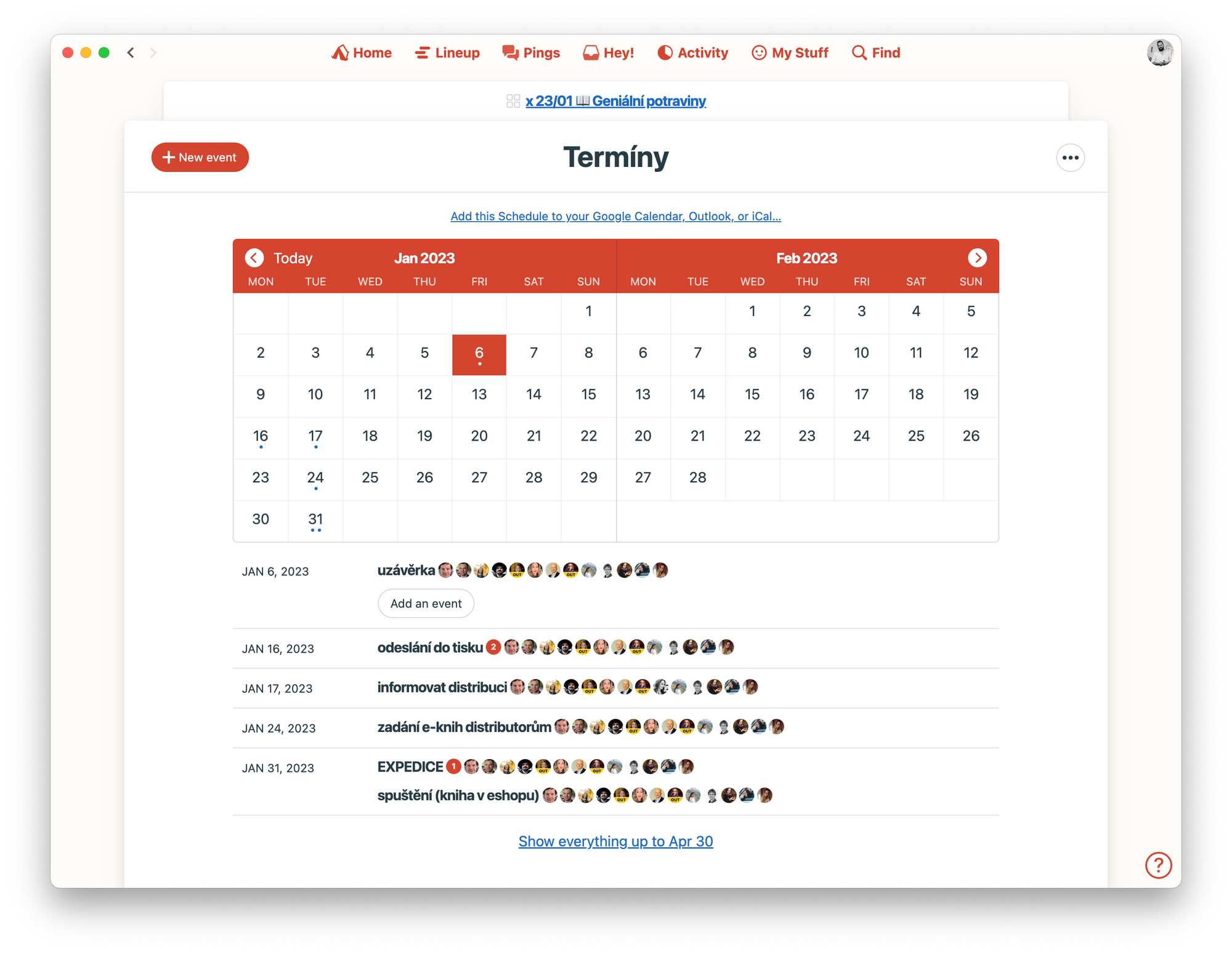 Např. jsme chtěli, aby naplánovaná data hlavních procesů knihy byla zobrazena i v daném projektu knihy v Basecampu, který sám Ganttův diagram nemá – zato má jednoduchý kalendář. Využil jsem k tomu jako v mnoha jiných případech Make (původně Integromat), tedy integrační službu, která všechny kritické události synchronizuje do basecampového kalendáře, aby ani tam nikomu nic neuteklo. Například ten úžasný okamžik odeslání do tisku :)