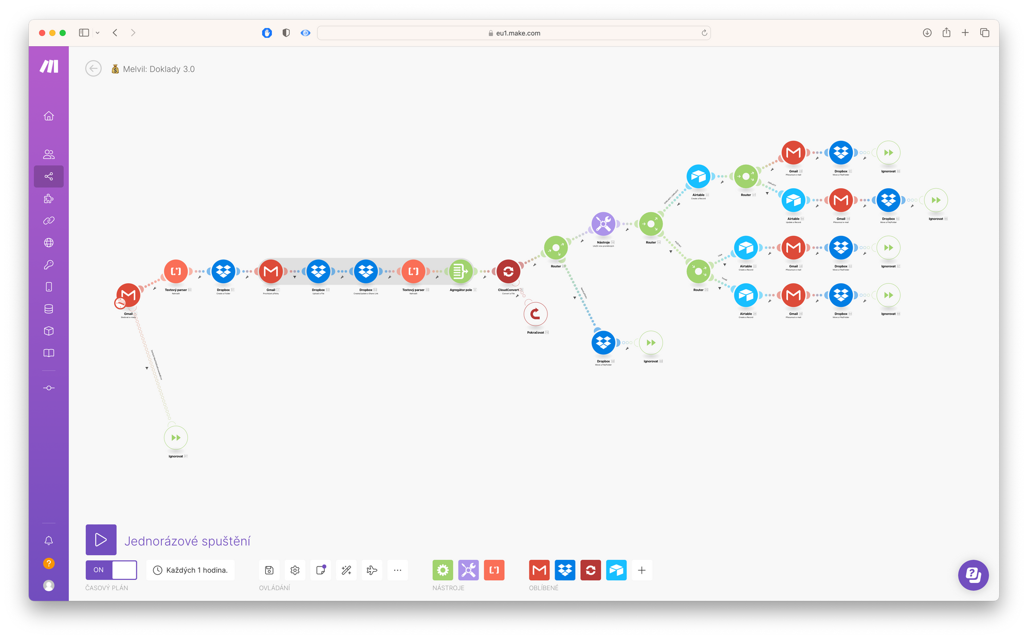 V tu chvíli u nás přichází na řadu další vychytávka – spádové e-maily. To jsou v našem podání e-mailové adresy, jejichž jediným účelem je informace z e-mailu roztřídit do polí a uložit je do báze v Airtable, kde s nimi dál pracujeme jako se záznamem v tabulce. Příkladem mohou být třeba faktury. Kdokoliv, komu v našem týmu dorazí faktura za zboží nebo služby, ji jednoduše přepošle na faktury@melvil.cz. Nepředáváme si fyzické kopie faktur (ty pomocí appek jako Scannable prostě vyfotíme a pošleme mailem tamtéž) a nemusíme myslet na to, kterému kolegovi nebo kolegyni danou fakturu předat či poslat.