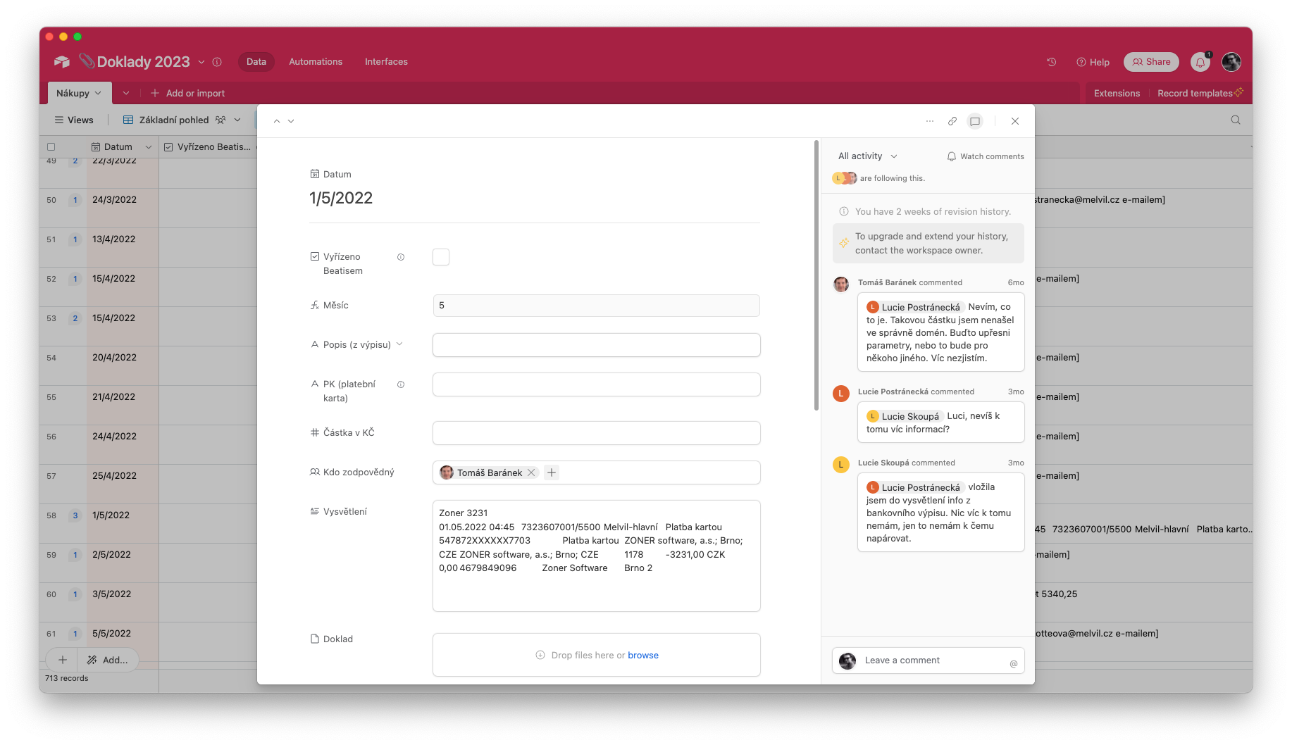 Jakmile doklad dorazí na faktury@melvil.cz, uloží se díky nastavené automatizaci (Make, viz výše) do naší dokladové tabulky v Airtable včetně příloh. Speciální dodatečně přidané značky v předmětu e-mailu mohou pomoci s roztříděním a změnou procesu, který následuje. Obvykle si zde doklad už vybírá kolegyně Lucie, ta příchozí fakturu proplácí, a pak naše účetní, která jej zavede do účetního systému. Stále máme přehled o tom, kolik dokladů nám v systému tzv. „visí“. A umožňuje nám to i jednoduchou diskuzi k tomu, zda je doklad v pořádku, něco na něm přebývá nebo chybí.