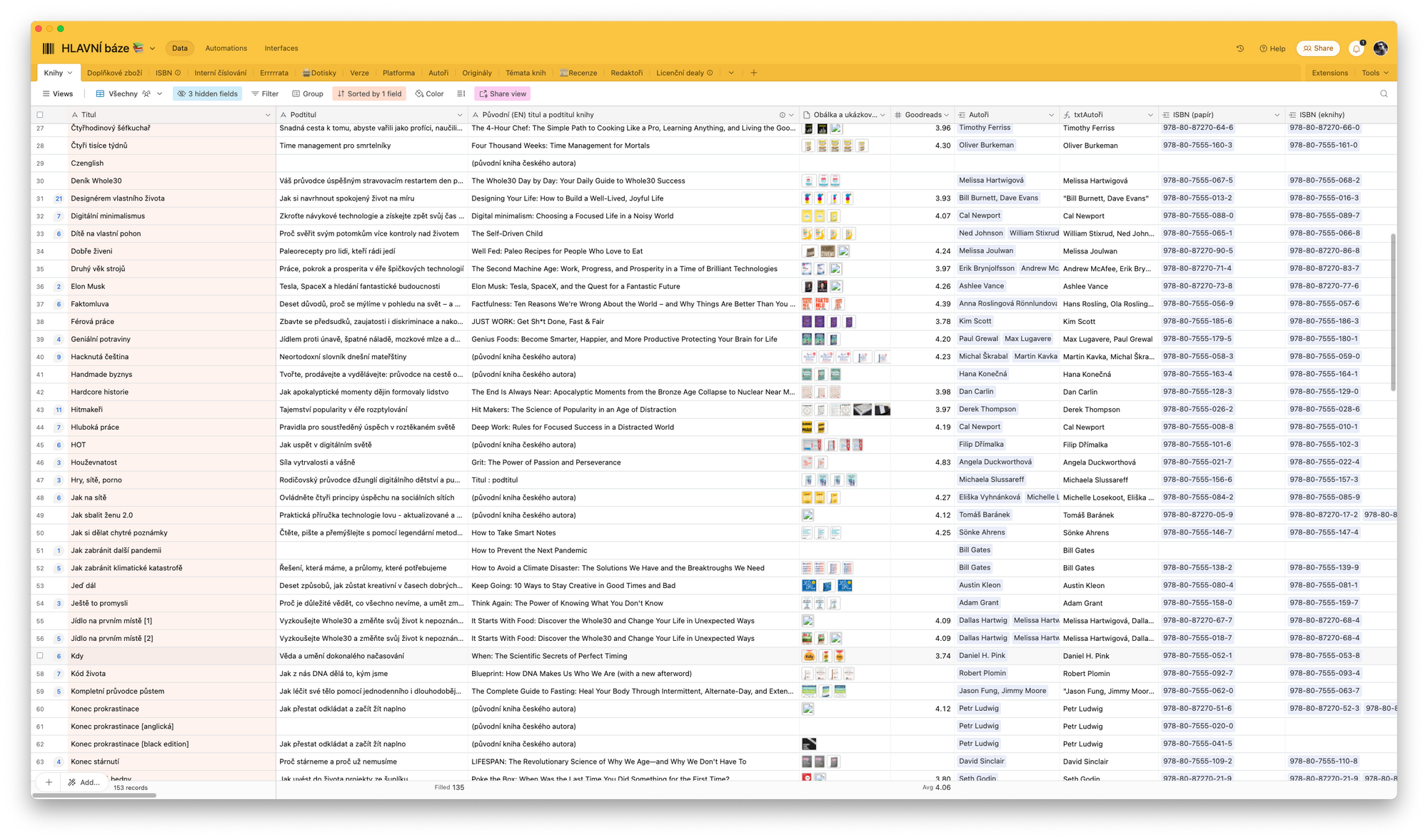 V Airtable už máme kompletní databázi podkladů ke knihám – kromě těch běžných informací, jako jsou české a původní názvy, anotace nebo ISBN kódy, obsahuje náš Airtable ukázkové kapitoly, technické informace o knihách (formáty, barevnosti, normostrany), data vypršení licenčních smluv, argumentaci pro knihkupce a další. Vše na jednom místě pro kompletní melvilí tým - markeťáky, administrativu, i redakci.
