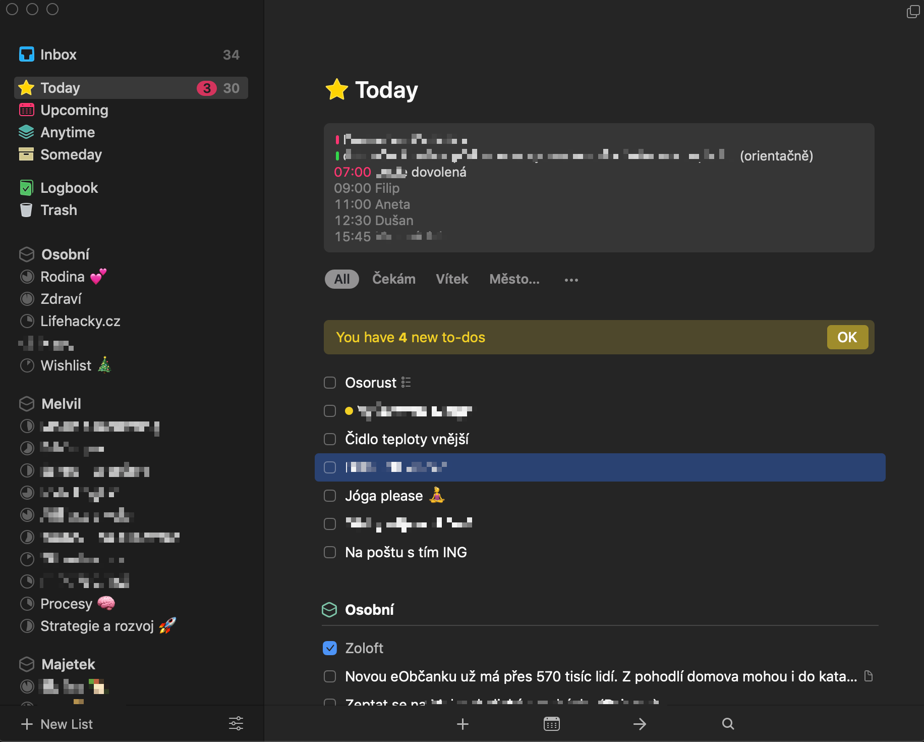 Nové systémy testuju vždy zásadně jen tak, že na začátku provedu převod (zde byl import z Things docela snadný) a pak nějaký čas současně používám obě platformy – starou i novou. Ano, trochu to komplikuje situaci a ano – připadám si jako někdo postižený duplicitidou. Ale mohu lépe porovnávat a hlavně: případný návrat k původní platformě je pak poměrně jednoduchý, protože novinku stačí přestat používat.