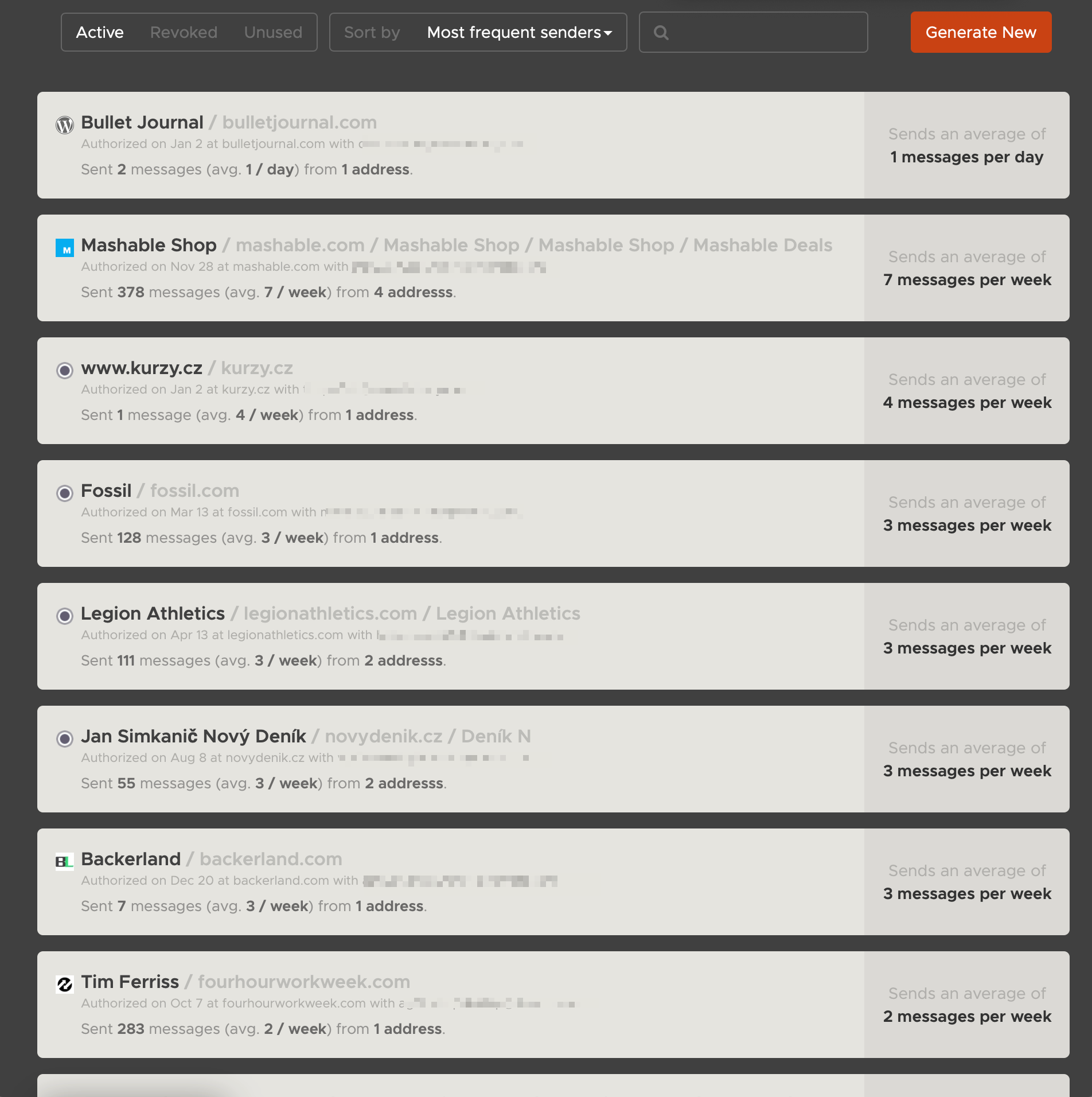 Funguje jednoduše: když se chcete někde zaregistrovat k odběru čehokoli, pomocí pluginu v prohlížeči (funguje v Chrome, Safari, Fireforu, Opeře a taky i na iOS a Androidu) si vygenerujete ad-hoc anonymizovanou jedinečnou adresu, která bude spojena výhradně s vámi a daným webem (web se ale nedozví, komu patří). Throttle vám bude pravidelně denně posílat výběr zpráv, které vám dojdou na všechny adresy, které jste si přes něj vytvořili. Můžete si je navíc třídit do kategorií a na pracovní adresu nechat posílat jiný výběr než na tu osobní. Pokud se rozhodnete nějaký odběr ukončit (např. když se vám to nepodařilo udělat přes web odesilatele), prostě jej přes Throttle jedním kliknutím zrušíte a nemusíte v newsletteru hledat tlačítko „unsubscribe“ či jej hlásit jako spam (což není fér, pokud je jediným prohřeškem, že vás newslettery už nebaví). Je to geniální a fakt to miluju. Do Throttlu dnes už padá většina mých registrací, navíc jsem si ho vylepšil vlastní doménou (kterou na nic jiného nepoužívám), takže mé ad-hoc adresy nekončí na obecné @thrott.com :).