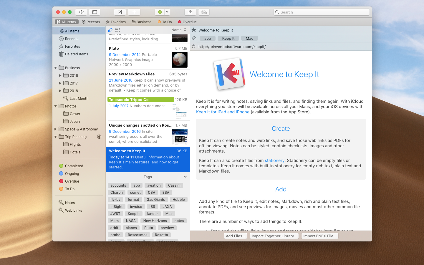 - letos se ovšem objevilo ještě jedno malé nezralé jablíčko v podobě aplikace Keep It, kterou dělají tvůrci ukončeného projektu Together; Keep It je postavena trochu jinak než Evernote a OneNote – funguje spíše jako shromaždiště, rozcestník odkazů na dokumenty než jako úložiště těchto dokumentů (ale umí je i uchovávat, jen to není default), takže je v základu „lehčí“ a svižnější; k ukládání vašich dat využívá iCloud, který lze považovat za bezpečný, pokud používáte plné zabezpečení, jenž nabízí platforma Applu; zkoušel jsem Keep It asi dva týdny a moc se mi líbí, až na dvě klíčové věci: 1. zatím není zralá a úplně stabilní (dětské nemoci jsou znát), 2. také neumí OCR dokumentů PDF a obrázků, ale tvůrce mi napsal, že „bude v roce 2019“; takže nezbývá než zvolat „I am keeping Keep It in the list“ :)