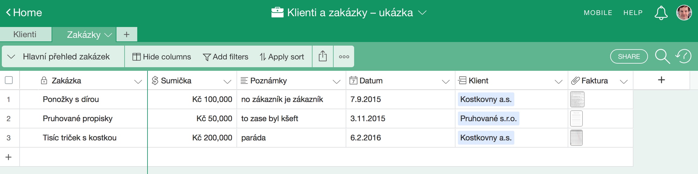 - umožňuje vkládat přílohy (obrazové, PDF, zvukové i jiné) do buněk, takže k zakázce přiložíte fakturu, ke kontaktu fotku (např. toto v klasických tabulkách uděláte jen obtížně)