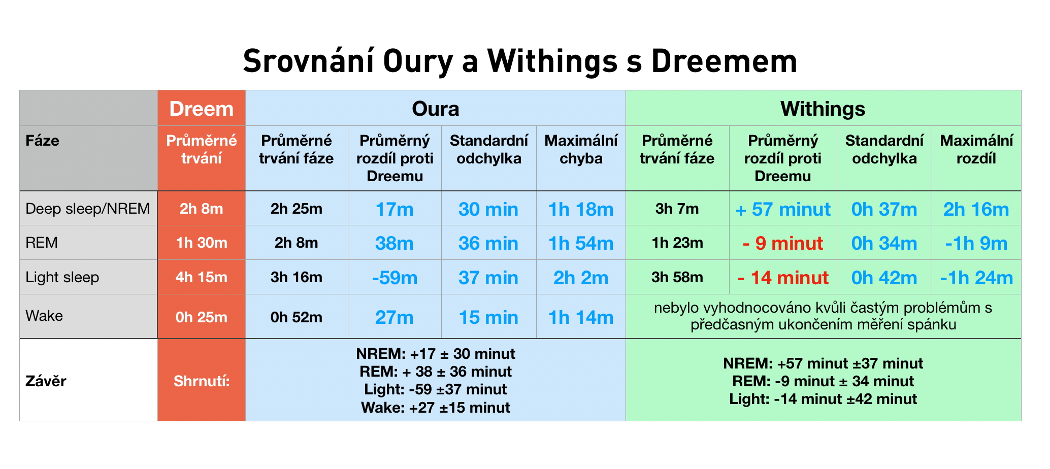 Můj závěr proto zní, že Withings a dokonce ani moje oblíbená Oura nejsou spolehlivé pro přesné vyhodnocování délek fází. Oura má nejmenší standardní odchylky od průměrné chyby (její rozptyl hodnot od Dreemu pro jednotlivé fáze méně lítá), takže o kousek vede před Withings a pravděpodobně i ostatními. Withings má zase maličko konzistentnější a přesnější výsledky v oblasti REM spánku. Chci do budoucna věřit, že v rámci více měsíců by snad mohla existovat aspoň základní shoda s realitou celkového trendu délky „kvalitních” fází REM + hluboký spánek (průměrovaných např. po týdnech).