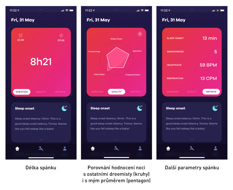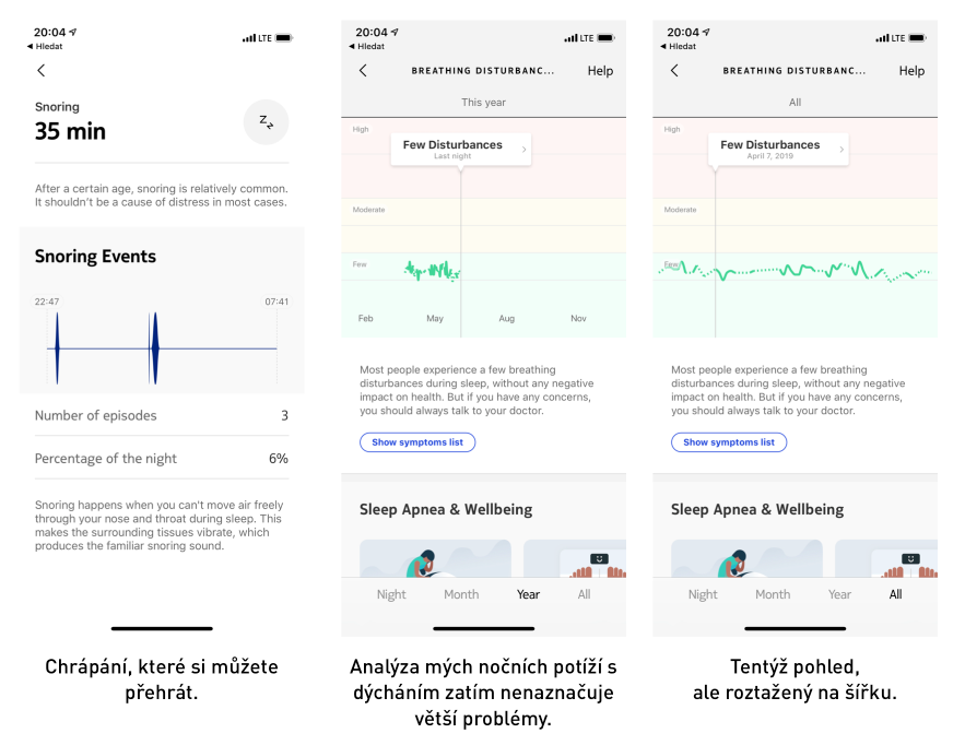 - aplikace je krásná, ale nestabilní; stejně nestabilní je i přenos dat: opakovaně se mi stalo, že se data nepřenesla, anebo se přenesla jen část (například tam byly průměrné hodnoty, ale graf noci byl prázdný atd.), což je opravdu frustrující, když si s tím tak hrajete a sledujete každé zavrtění;