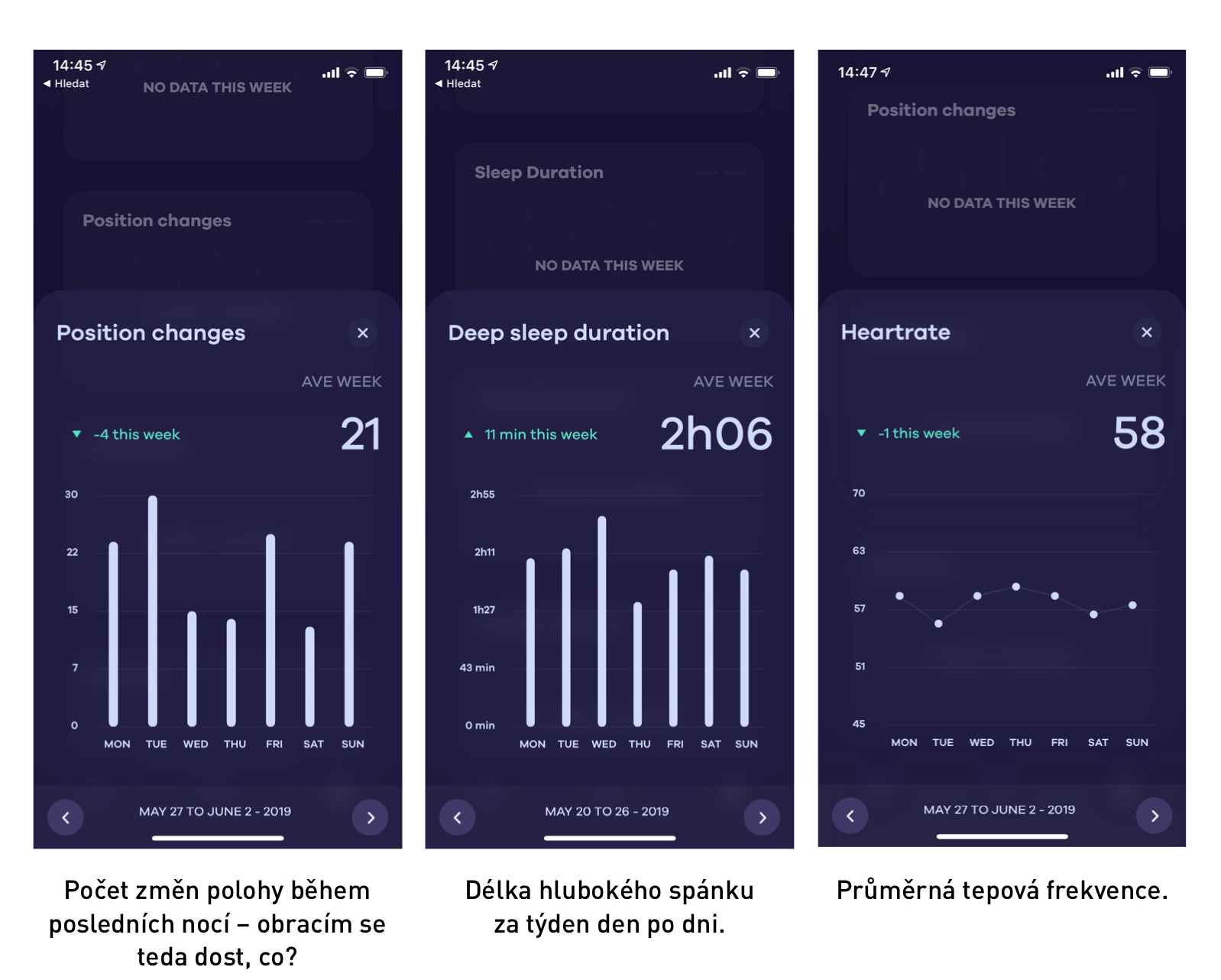 - jak už jsem naznačil výše, chybí mi propracovanější možnost sledování dlouhodobějších trendů a štítkování dní/nocí pro pohodlnější porovnávání veličin jako je tomu u některých dalších gadgetů (zejména Oury či Go2Sleep); v aplikaci lze vidět naměřené hodnoty jen odděleně, pod sebou, graf za grafem, a to týden po týdnu; export dat je naštěstí možný, ale zase není příliš podrobný; webové rozhraní jako má například Oura by celou věc pro zkušenější sebeměřiče posunulo o další stupeň výše, dále (a hlavně hlouběji);