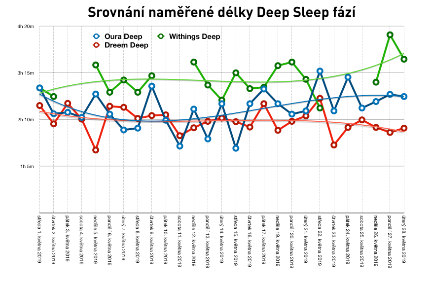 Co dlouhodobější trendy? Tady to začíná být zajímavé. Na první pohled na vzorku mých 27 dní dlouhodobější trendy moc nesedí (to jsou ty barevné linie v grafech). Zatímco Dreem vyhodnotil, že se mi za květen postupně výrazně zlepšoval REM, Oura naopak naznačuje pokles a Withings stagnaci. Pokud jde o hluboký spánek, Withings jde dokonce úplně opačným směrem než Dreem. Oura ale ukázala cosi velmi pozoruhodného. Pro hodnocení hlubokého spánku je obstojně přesná v první půlce měsíce, ale pak se začne s Dreemem rozcházet. Tvrdí, že hlubokého spánku přibývá, ale dle Dreemu zůstává víceméně stejný. Mám takovou hypotézu: od půlky měsíce začal nabíhat efekt stimulací, které mají prohlubovat hluboký spánek. Když je hluboký ještě hlubší, možná si mozek a tělo odpočine a lépe zvládne i další fázi noci? Aspoň to naznačují data z Dreemu, kde kolem 10. května začíná délka REM narůstat. Proč to má vliv na odhad délky hlubokého spánku podle Oury, můžeme jen spekulovat; snad to souvisí právě s heuristikou Oury, která za „nastimulovaný“ hlubší hluboký spánek považuje i předělové fáze.