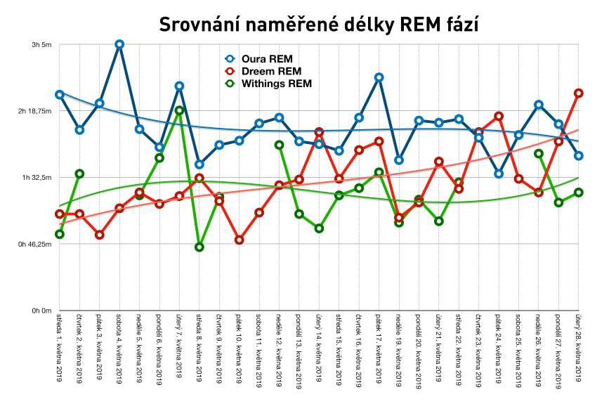 Když se podíváte na rozptyl hodnot Oury a Withings od Dreemu, všimnete si nepříjemných momentů: už na první pohled to nesedí o desítky minut. Horší ale je, že někde nesedí ani celkové trendy. Jsou tam kratší série několika dní, kdy podle Dreemu dochází k postupnému zkracování/prodlužování hlubokého spánku, ale Oura či Withings vykazují přesně opačný trend. Totéž se týká REMu, kde jsou rozdíly ještě markantnější: