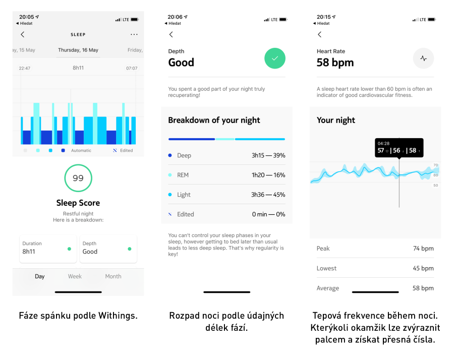 Pokud jde o Withings Sleep, už jsme si řekli, že má trable poznat, kdy jsem v posteli. Withings si v první fázi noci nevšiml, že jsem byl dvakrát krátce úplně probuzený (a to několik minut, i jsem si to pak pamatoval) a pak to kolem čtvrté jednoduše zabalila úplně (protože jsem tam vzhůru byl déle, šel se vyčurat, pak jsem zůstával v posteli a snažil se usnout):