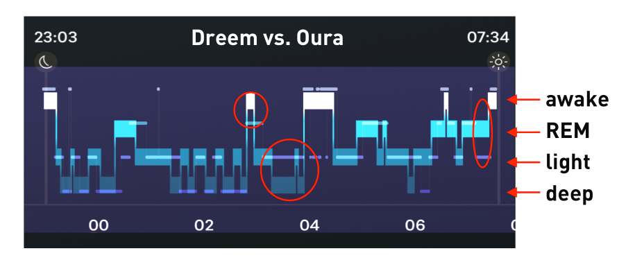 Oura má s ranní fází problém, kdy považuje za REM spánek i klidné bdělé ležení či lehký spánek, což kazí její průměr v oblasti REMu/light. U všech měřičů kromě Dreemu tedy musíte téměř každý den ručně upravovat začátky a konce nocí, což jsem dělal i v době měření, takže paradoxně výsledek všem zařízením kromě Dreemu nadržuje, pokud jde o přesný odhad celkové doby spánku.