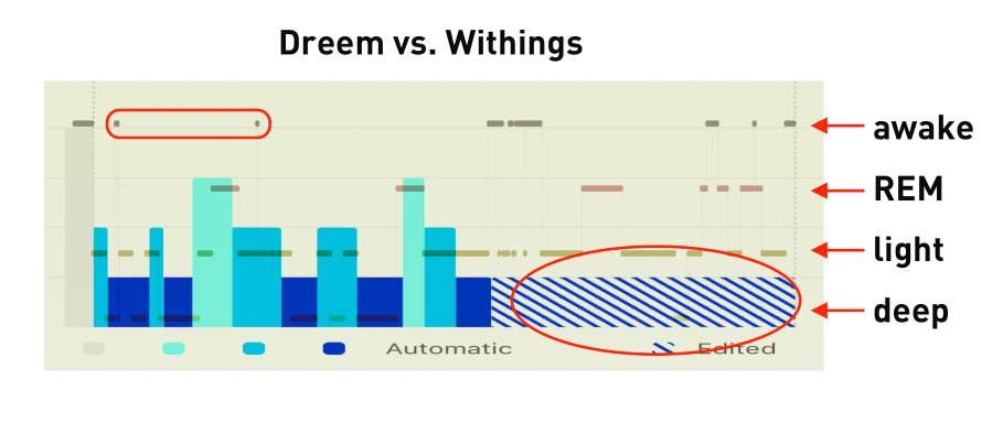Jediný Dreem spolehlivě pozná, kdy opravdu usnu a kdy jsem (v noci i nad ránem) vzhůru: to poznám jednoduše i proto, že si to téměř denně obstojně pamatuju :).
